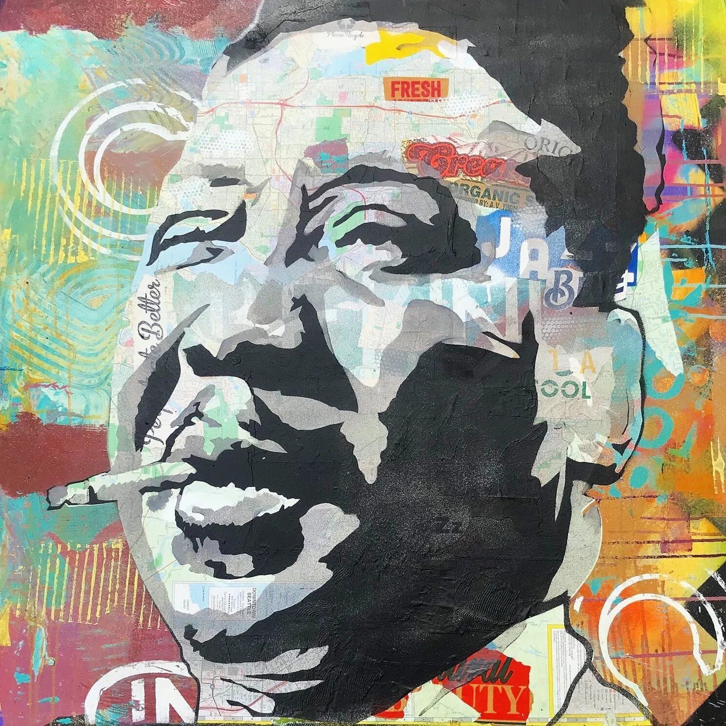 MLK Jr. (January 15, 1929 – April 4, 1968) MLK Jr. is a homage to the great Dr. Martin Luther King Jr. and his accomplishment as a leader in the civil rights movement. It holds a light to the freedom fighters of the past, present, and future. King reminds me everyday that it is important to dream of a bright future and talk with your neighbor to breathe life into making dreams reality. “Injustice anywhere is a threat to justice everywhere.” - MLK Jr. The background abstraction is created by collaging sentimental articles of found paper, such as, maps, sheet music and drawings created by my children. The articles allow me to reflect on my thoughts and experiences as a father and artist. The process of creating this painting has enlightened and helped educate my children about African American history.