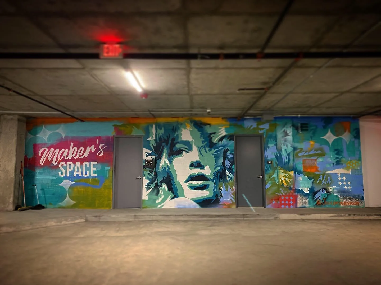 Co-Motion stands as a beacon for the UW community on their journey of innovation, offering the tools, connections, and expertise needed to transform ideas into tangible economic and societal impact. Our creation is a multi-layered mixed-media mural, drawing inspiration from the graceful rhododendron blossoms and the iconic cherry blossoms. In a collaborative spirit, we invited the staff and students to join us in crafting a colorful backdrop adorned with unique splatters and brush strokes. It is a profound honor for us to see our work of art come to life within the walls of Condon Hall, adding a touch of creativity and inspiration to the UW campus.